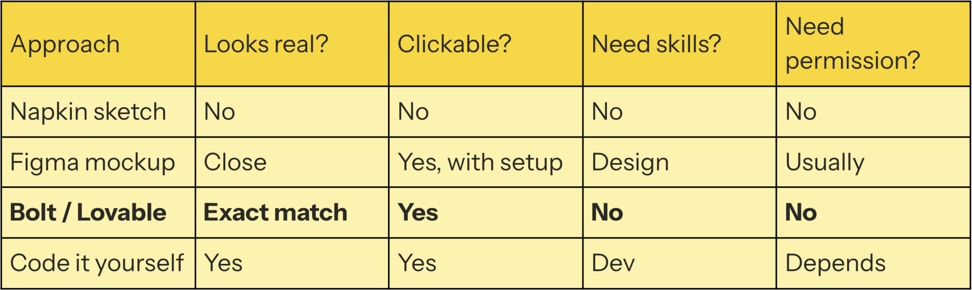 The basic idea is that in the time it takes to do your morning standup, you could copy code straight from a live product, paste it into an AI tool (think: Bolt, Lovable, Replit, and v0), and modify it. All while keeping the same fonts, spacing, and everything else. That way, your stakeholders can click through + review your big idea quickly—instead of squinting at a document or waiting for it to trudge down the pipeline.